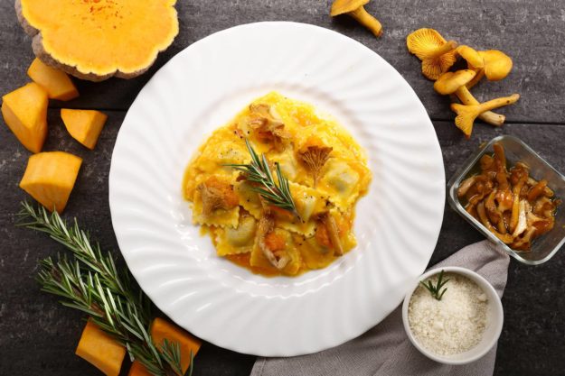 Ravioli alla Zucca alla carbonara di zucca e finferli